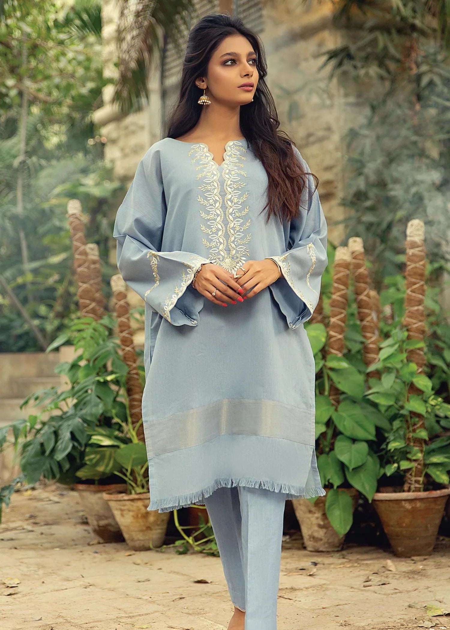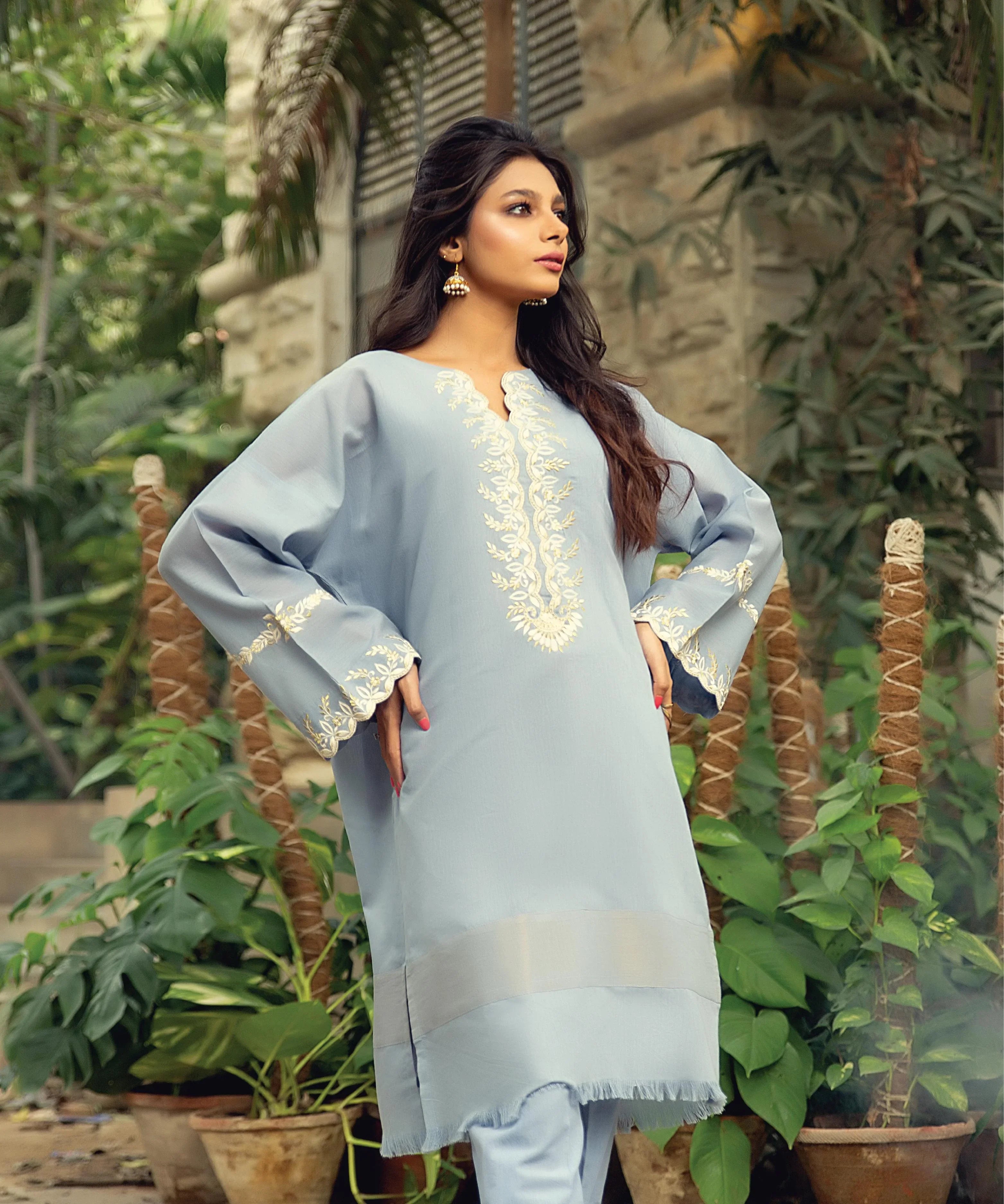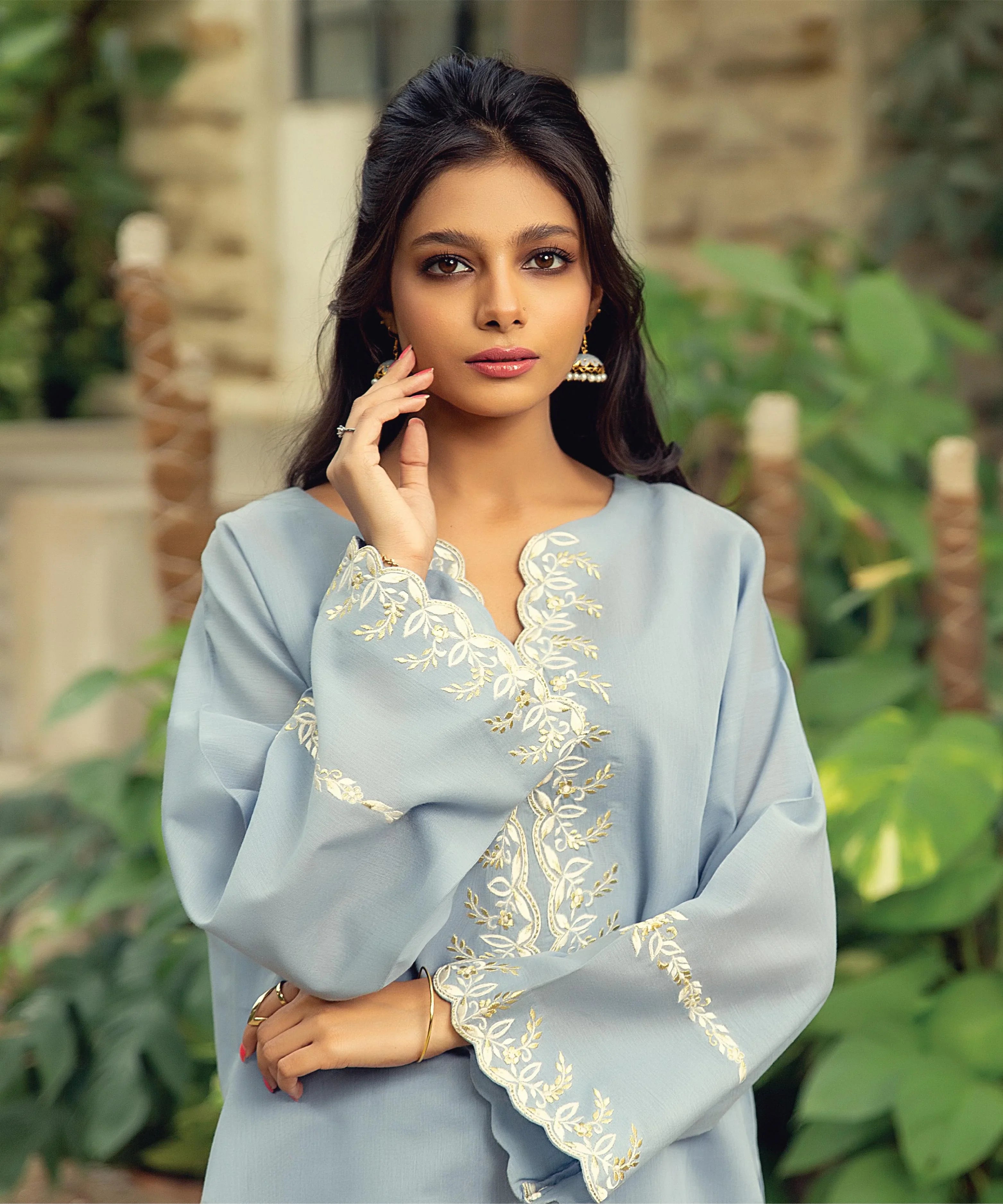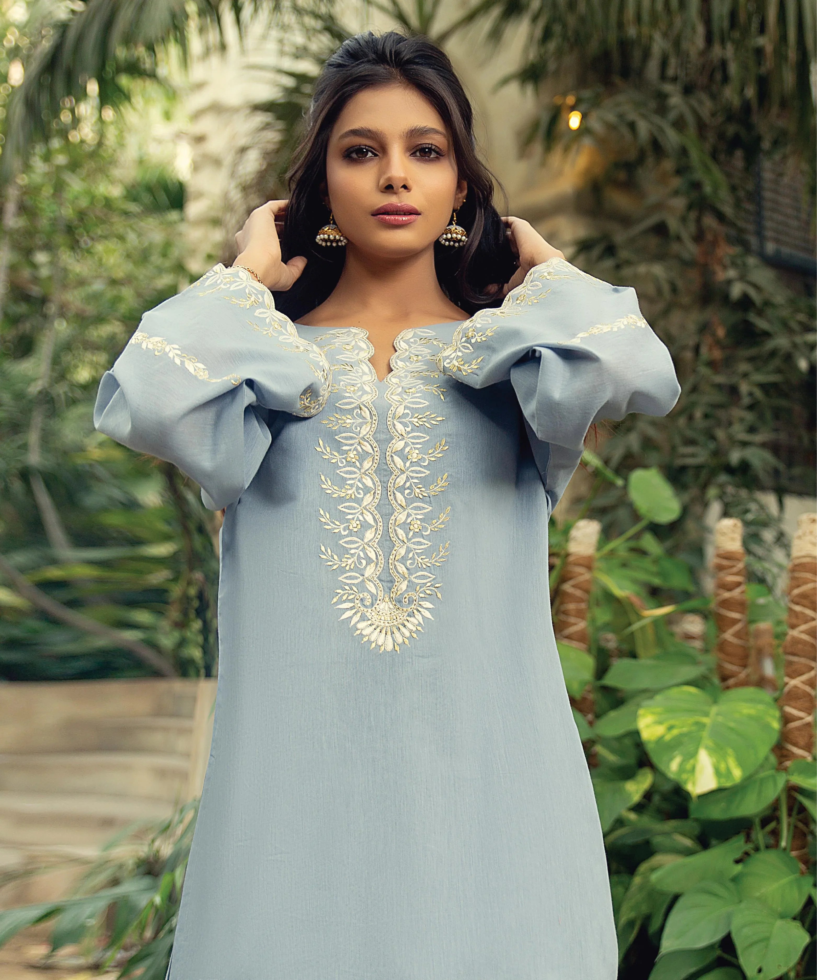 Step into sophisticated tranquility with our 'Azure Whispers' Two-Piece Set. This ensemble, presented in a serene sky-blue hue, is a perfect marriage of traditional craftsmanship and modern design. Its soft color palette and exquisite detailing make it a versatile choice for both daytime elegance and evening gatherings. The straight-cut kurta...