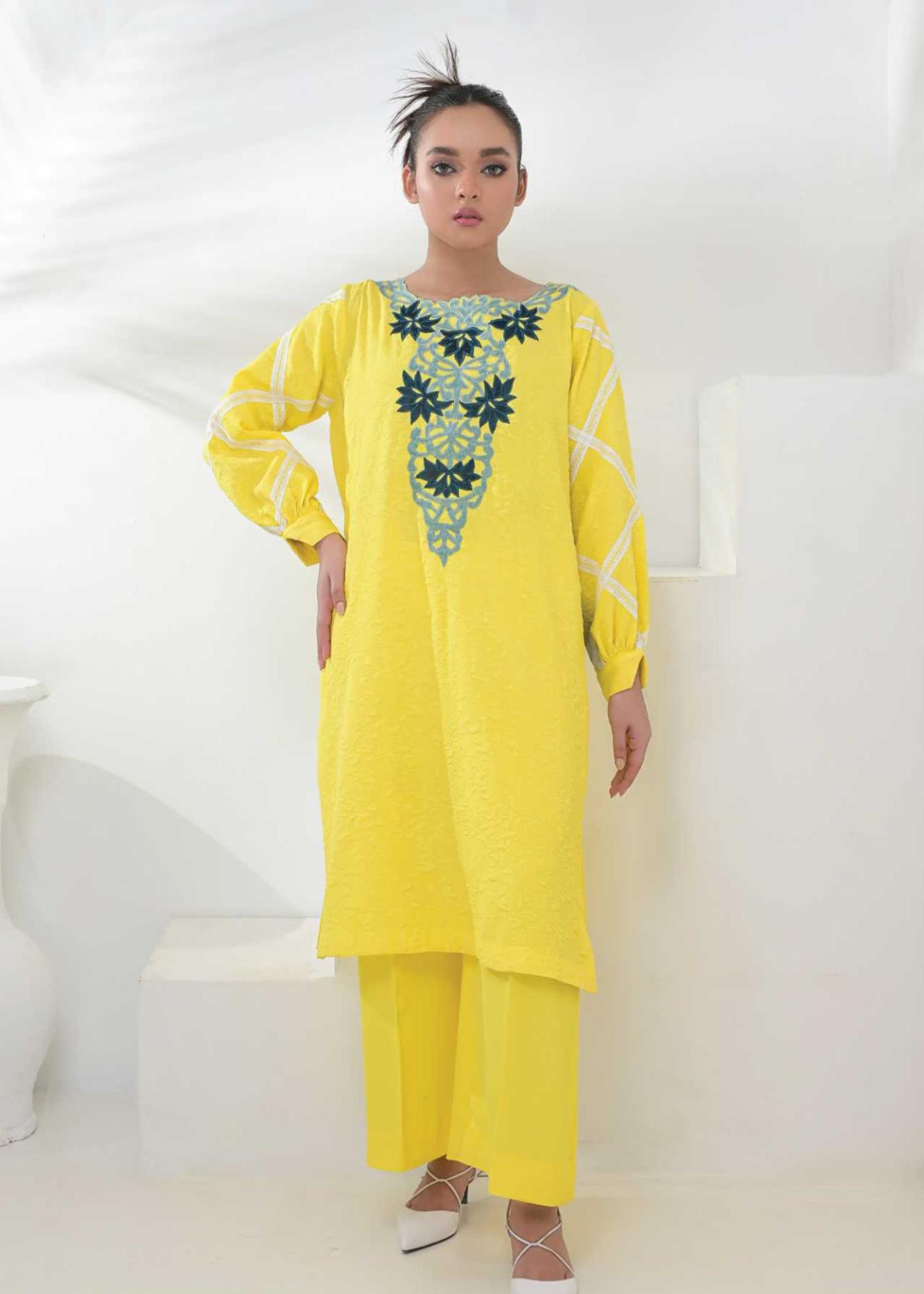 Appliqued details on side lines and necklines with lace detailing paired up with flared pants.Fabric: Turkish GeorgetteColor: CreamModel is wearing size Small