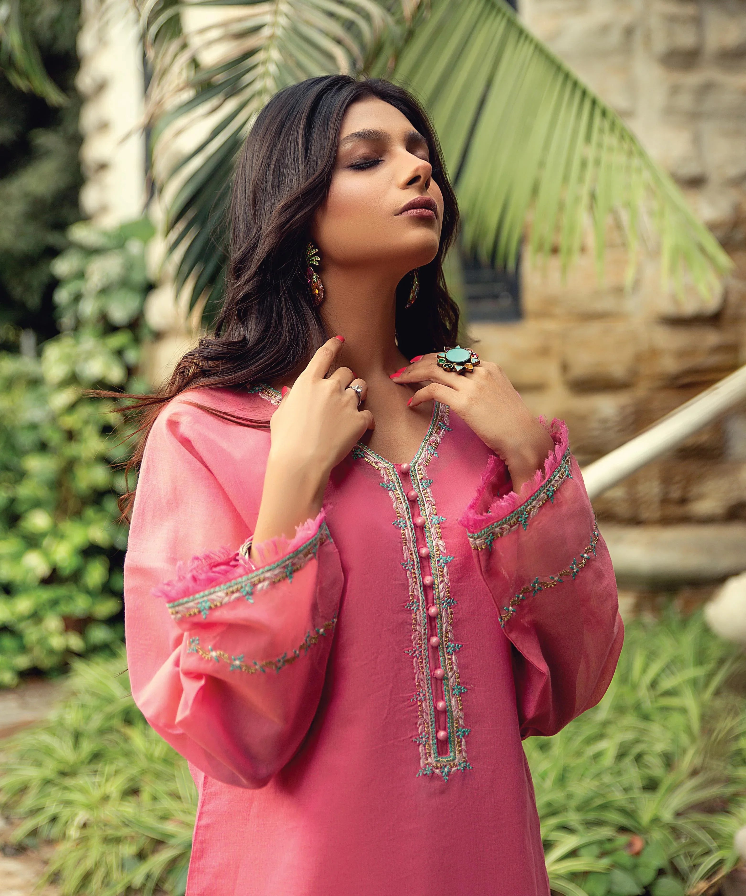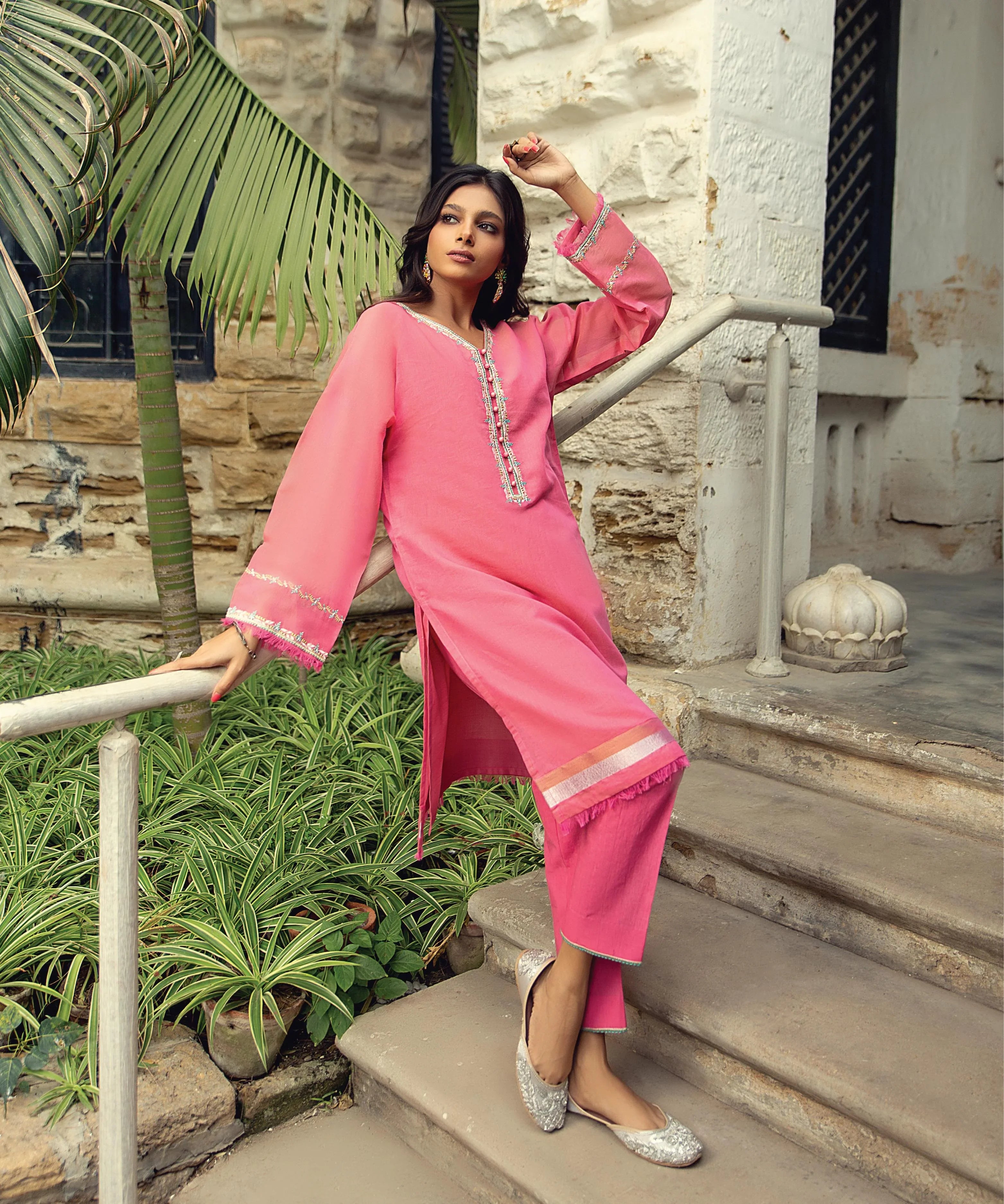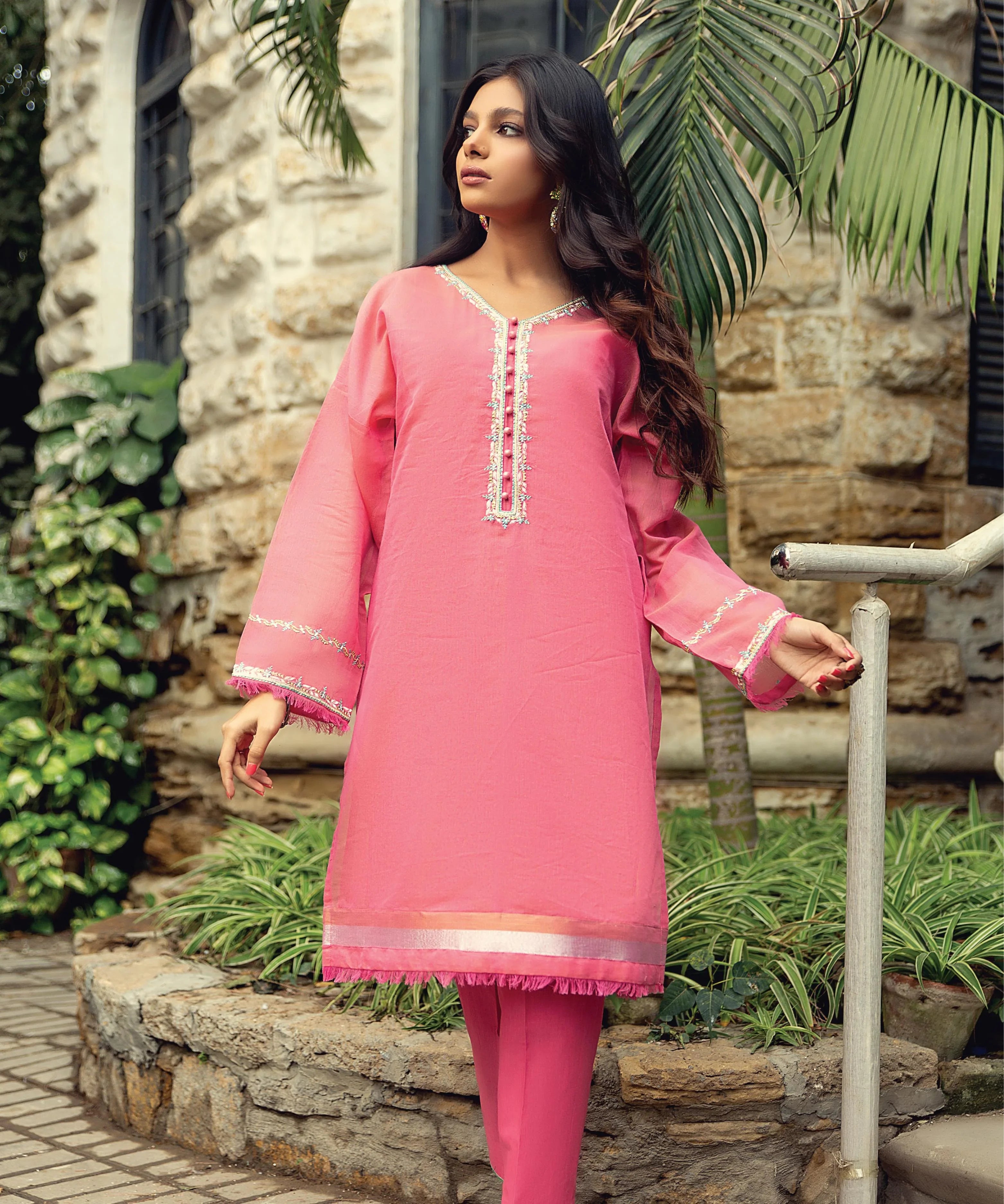 Step into effortless elegance with our Blush Pink Embroidered Two-Piece Set, crafted to add a fresh and feminine charm to your wardrobe. The soft pink hue radiates sophistication, while the minimal yet intricate embellishment on the neckline and sleeves lends a touch of graceful detailing. The straight-cut kurta, tailored from...