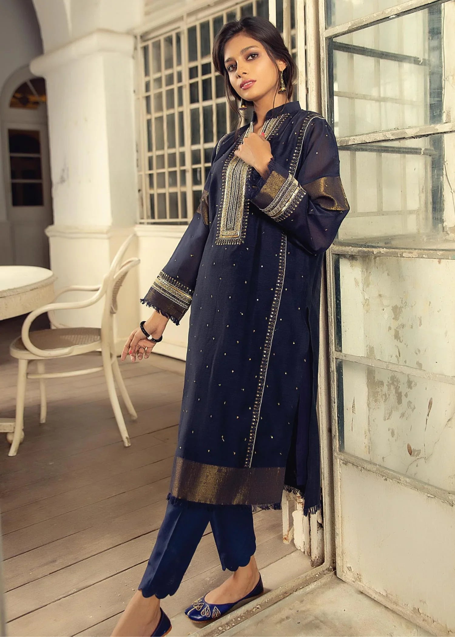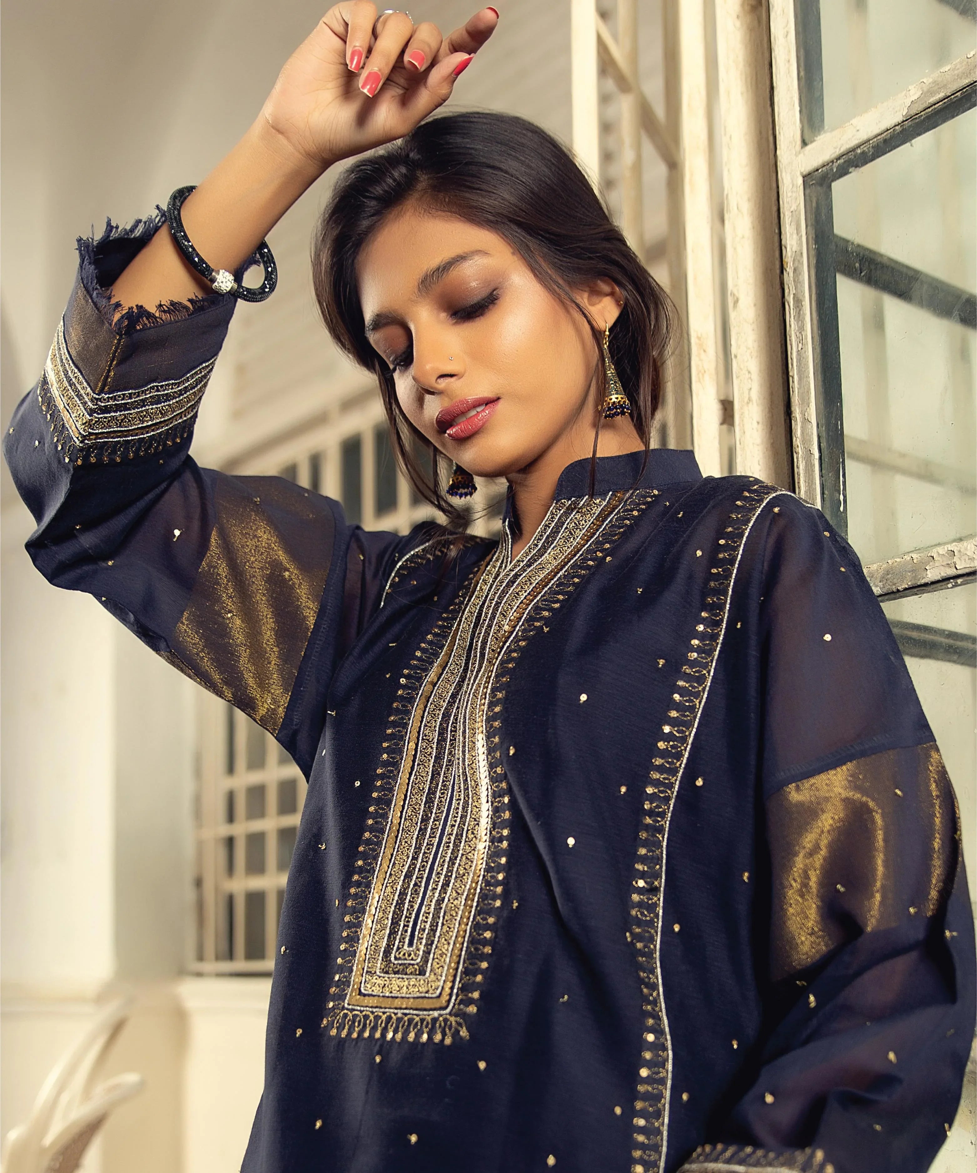 Make a striking statement with our 'Midnight Radiance' Two-Piece Set. This stunning ensemble, in a deep and luxurious navy blue, is designed for the modern woman who embraces bold elegance. Perfect for evening affairs and festive celebrations, this outfit combines classic design with rich, opulent details. The straight-cut kurta is...