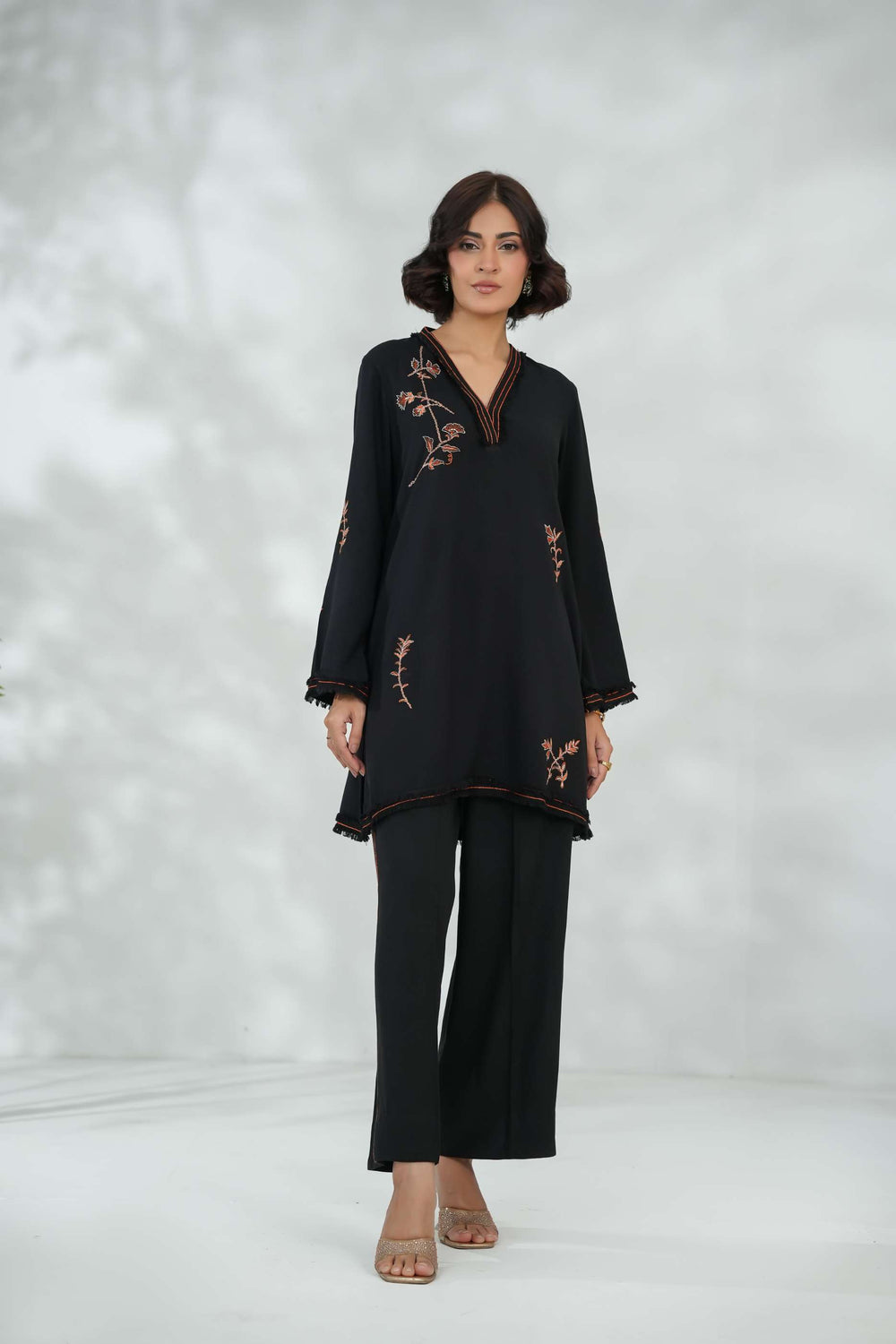 Bold yet timeless — Midnight Bloom redefines classic black with intricate tonal embroidery. The straight-cut silhouette and minimal detailing make it a go-to for evening occasions when you want quiet luxury with striking presence.
