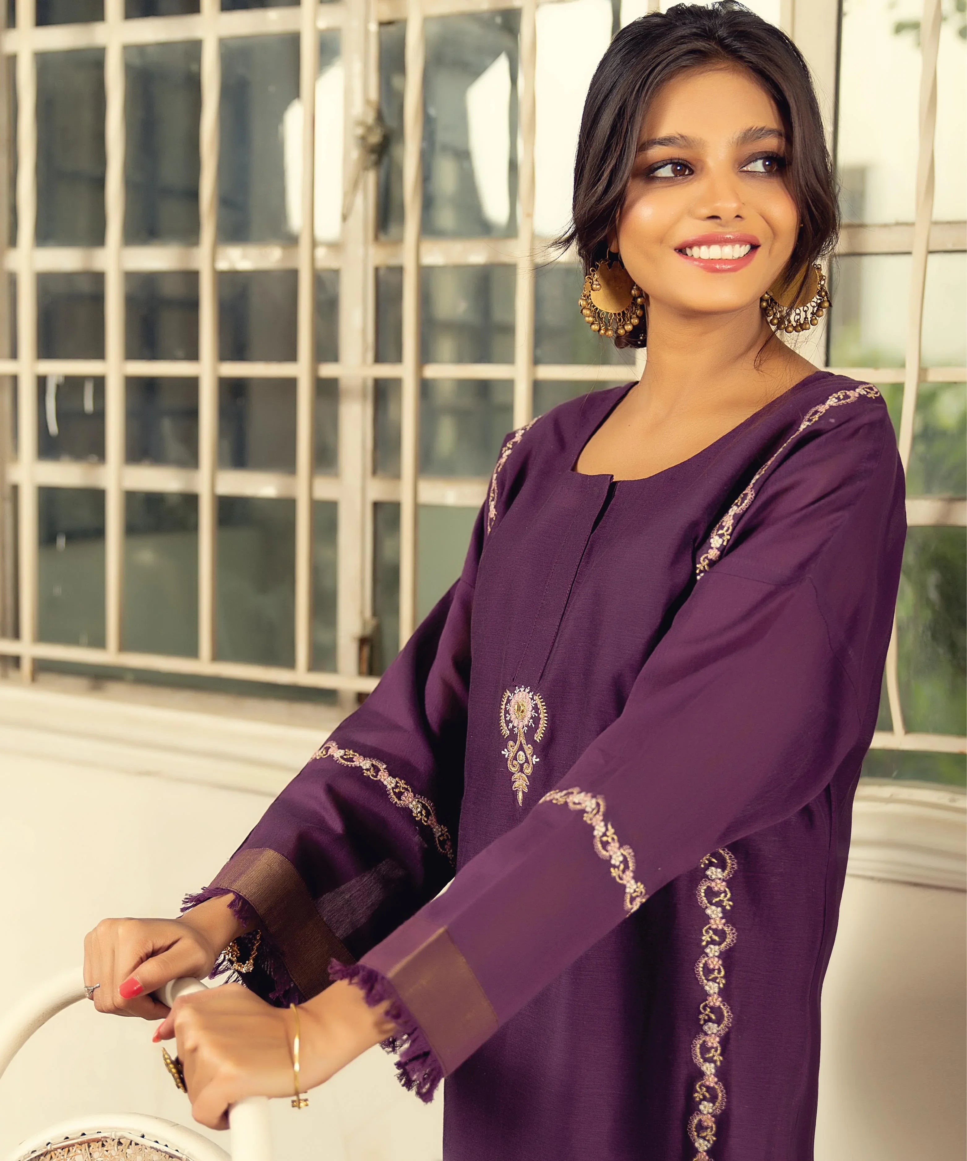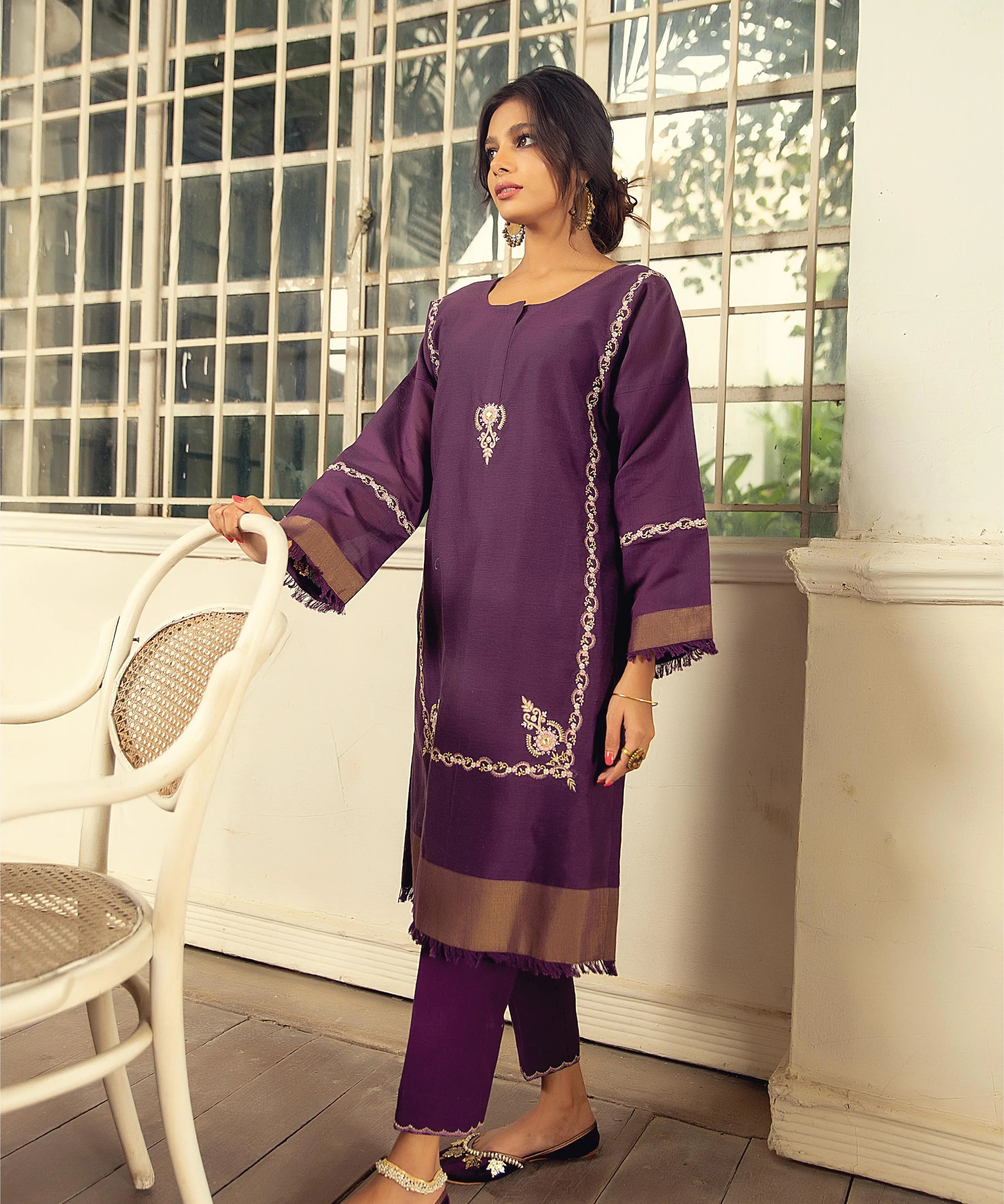 Indulge in the rich allure of our 'Amethyst Bloom' Two-Piece Set. This captivating ensemble in a deep purple hue is a harmonious blend of traditional charm and contemporary style. The straight-cut kurta features exquisite golden floral embroidery along the neckline and a delicate trailing vine motif down the front and...